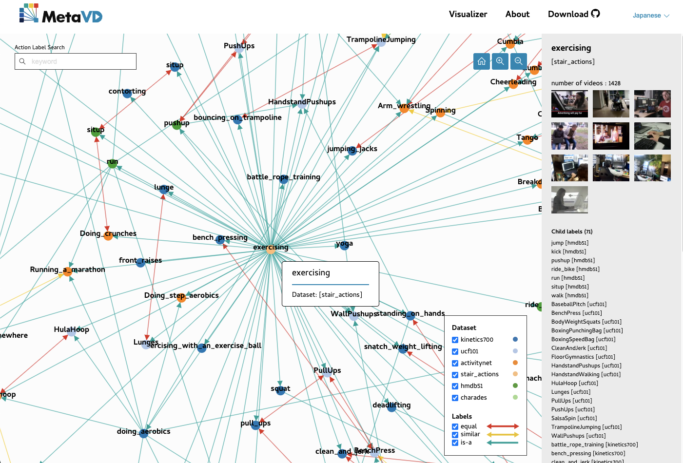 MetaVD は、Kinetics-700やActivityNet等の動作認識データセットの間で、動作クラス間の関係性を人手でアノテーションしたデータセットです。 複数の動作認識データセットを用いた動作認識モデルの学習に活用することを目的としています。 MetaVDで提供されている動作クラス間の関係は、MetaVD Visualizerで調べられます。