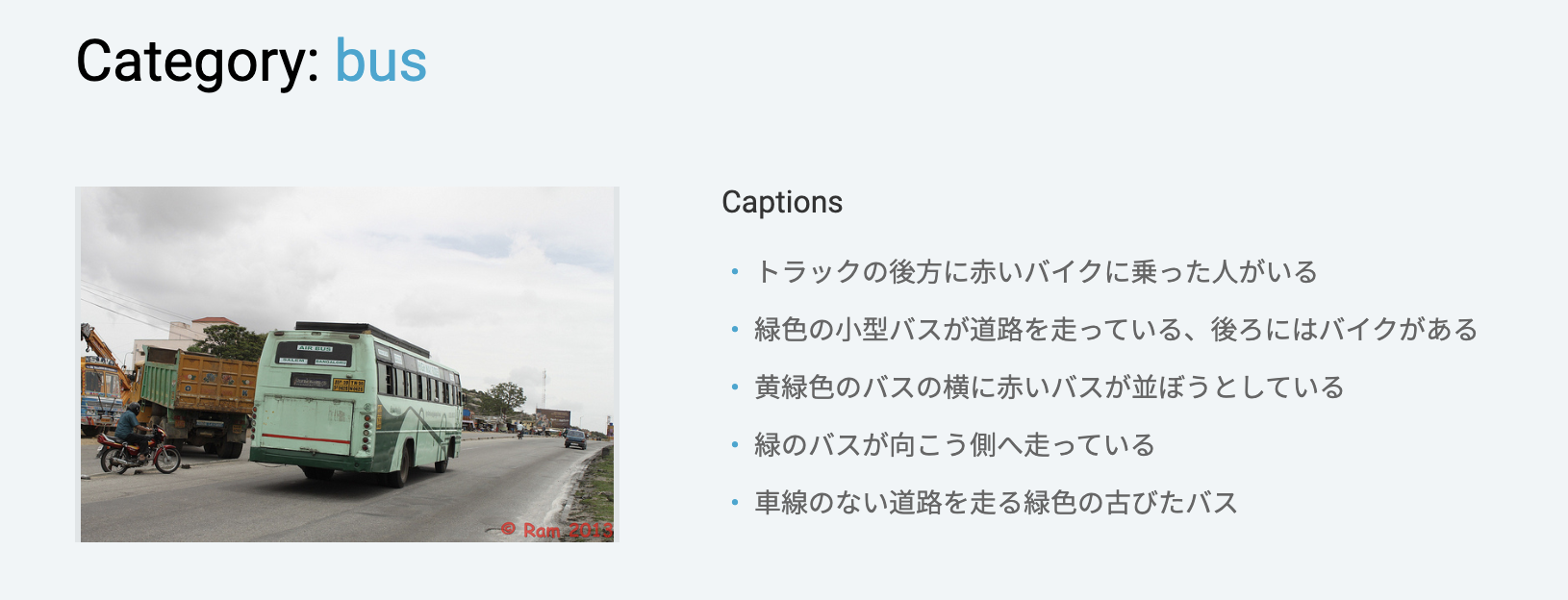 STAIR Captions は、STAIR Captions は大規模日本語キャプションデータセットです。 MS-COCO の画像に対して、キャプションを付与しており、全部で820,310件のキャプションで構成されています。 このデータセットを用いることで、画像に対するキャプション生成、検索などの学習を行うことができます。